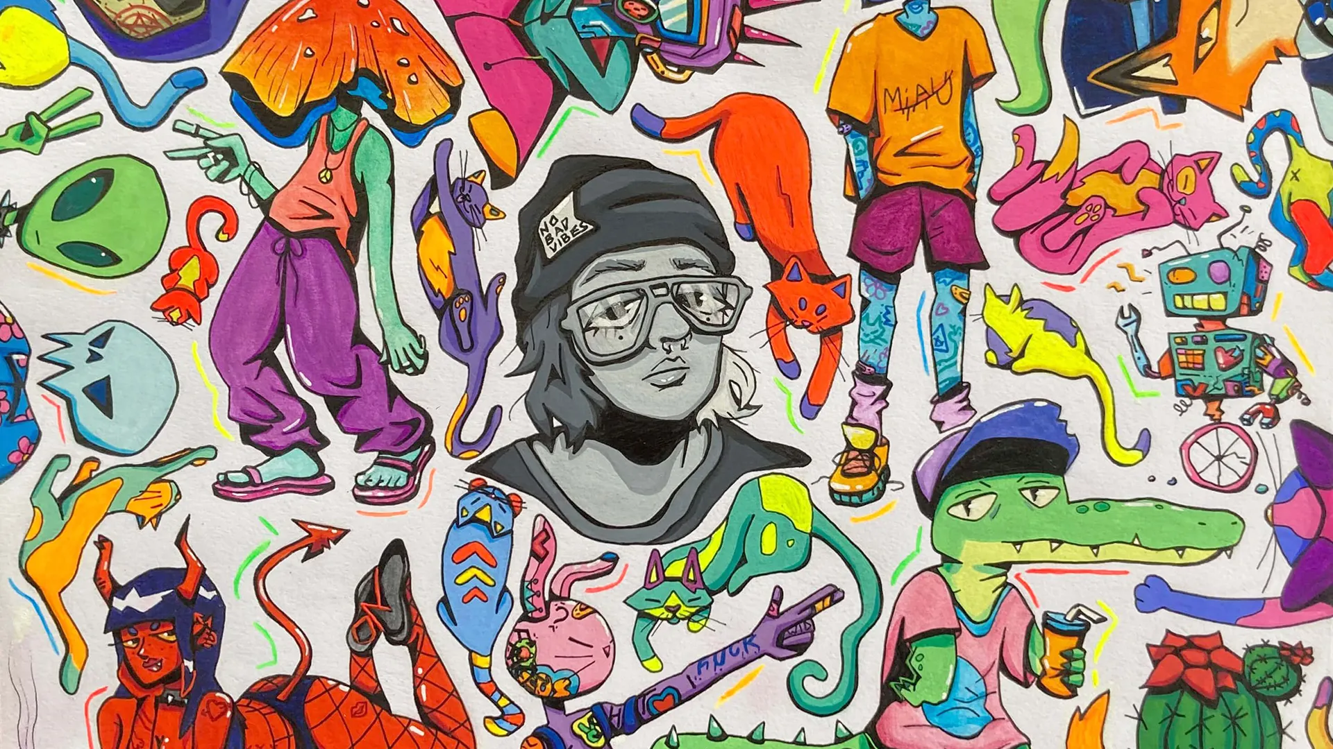 Renata describe cómo comenzó a desarrollar personajes de cuerpo completo, utilizando cajas y líneas de acción para definir su anatomía. Por ejemplo, un hombre hippie con cabeza de hongo tiene curvas suaves que le dan una sensación de relajación, mientras que un hombre con una cassette por cabeza tiene una postura más firme pero tranquila, con las manos en los bolsillos. «Aunque rara vez uso curvas, defino más mi estilo usando líneas rectas. Juego con formas básicas como círculos, cuadrados y triángulos para definir la personalidad del personaje», explica Renata.